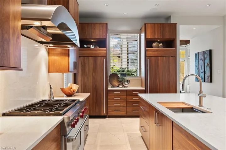 Designer luxury lakefront estate offers a blend of tranquility, sophistication, views and exceptional quality throughout. Best of all, the home was built above the current FEMA level, and home, garages, cabana and pool are high and dry and have never been close to flooding from any hurricane. The FEMA flood insurance policy is under $1,000. Designed by architect John Cooney, the 7,660-square-foot residence is an architectural masterpiece, featuring a harmonious mix of warm tones and a refined minimalist aesthetic. From the moment you walk through the entrance, there is a sense of subtle elegance and meticulous craftsmanship that defines every aspect of this exceptional property. The gourmet kitchen is outfitted with luxury appliances, dual islands with new quartz countertops, walnut cabinetry and an adjacent dining area. The adjoining living area complements this space with a gas fireplace, while a dedicated wine area boasts double beverage refrigerators and wet bar, ideal for entertaining. An adjacent theater room provides a private cinema experience. The primary suite is complete with a tranquil sitting area, a spa-like bath featuring premium finishes, and an attached fitness room for convenient at-home workouts. Step outside onto the expansive covered lanai, where indoor and outdoor living blend seamlessly with a gas fireplace, ample space for lounging and dining, and breathtaking panoramic views of the sparkling lake. The outdoor oasis extends to a separate guest cabana, overlooking the magnificent infinity pool. Multiple seating areas highlight the views of the surrounding lake, while lush landscaping adds a sense of privacy. Three blocks from the pristine sandy beaches and a short distance from the renowned shops and restaurants of Fifth Avenue South, this exquisite estate provides a serene escape in one of Naples most desirable neighborhoods, amid luxurious residences and meticulously maintained tropical landscapes.