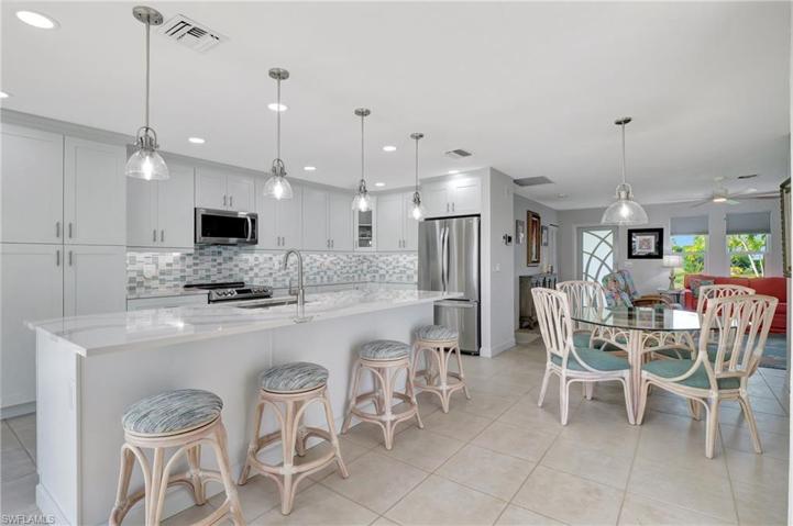 Move-in ready! This GULF ACCESS home is a gem just waiting for you to discover! The split bedroom plan with newly re-modeled kitchen offers this fantastic view from practically every room. The rear wall of the dining area has been opened & an additional triple sliding door has been added to take advantage of the view. The master bedroom suite and bath includes a charming garden area for you to enjoy your tropical plants; the floors are of all porcelain tile…no carpeting, furniture and appliances are included. New Roof 2022. All windows and doors are hurricane protected. The oversized lot is lushly landscaped with palm trees & tropical plant varieties and affords privacy all around plus opportunities to expand, if you wish. This gulf access home is centrally located for easy access to all amenities; restaurants, shopping, schools, and parks. Home Warranty Included!
