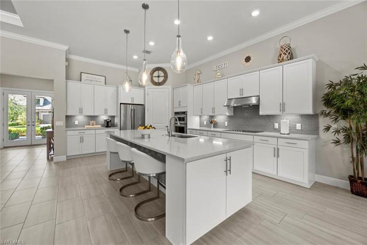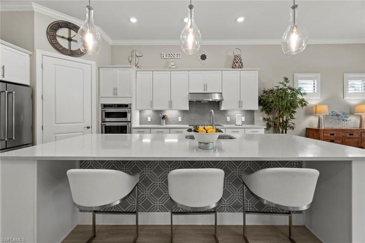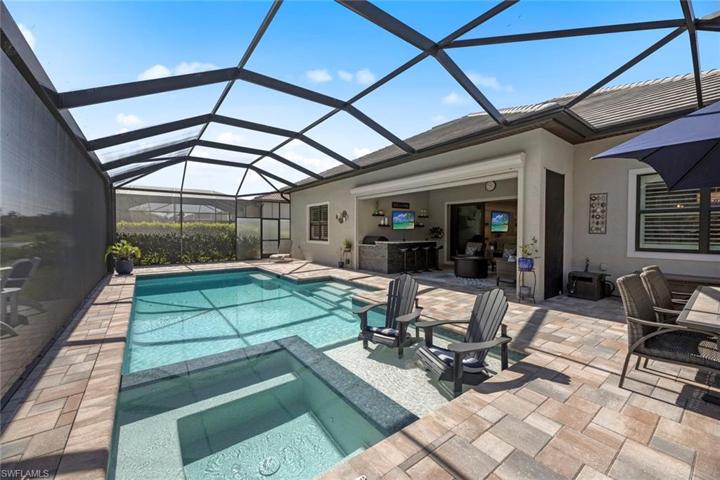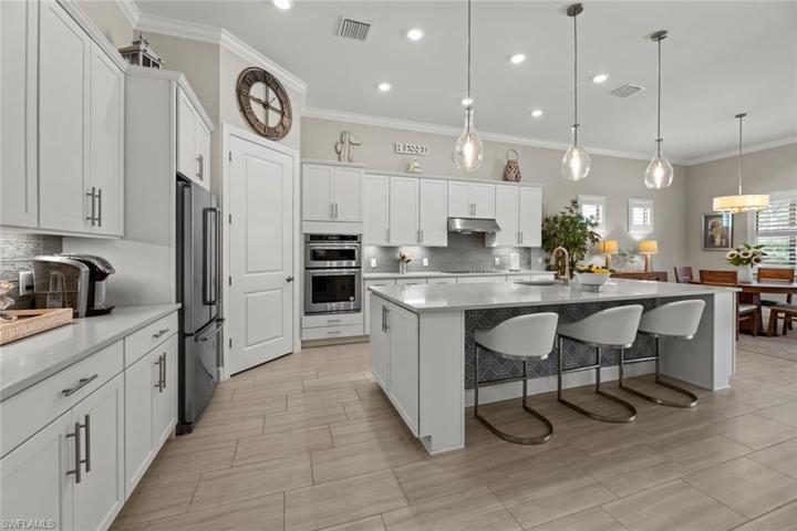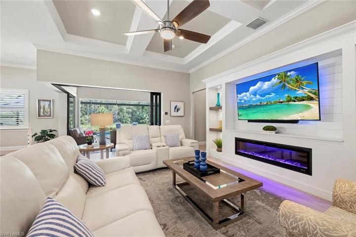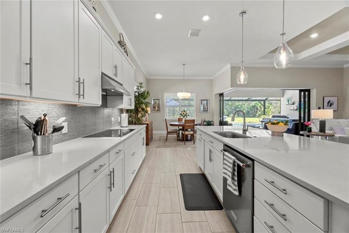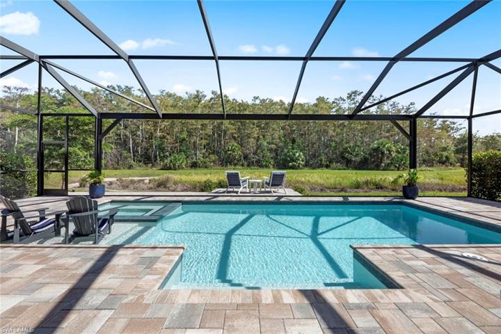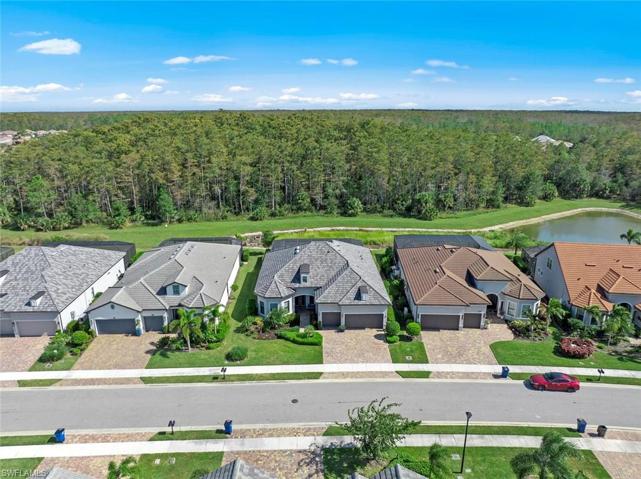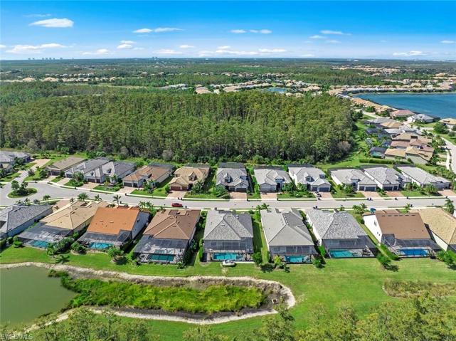 This beautiful open floor plan, 3 bed+den, 3 bath home can be yours located in upscale, Coastal-themed Corkscrew Shores in Estero with its’ spectacular large lake and NO CDD! No expense spared with many upgraded features throughout! Crown molding, coffer ceilings, wood plank tile, zero corner sliders, plantation shutters, impact glass, extended patio. Entertain your guests in the upgraded gourmet kitchen with built-in appliances, quartz countertops, glass backsplash, oversize island with pendants. Guests will enjoy GR with a built-in entertainment center and relaxing fireplace. Step out to the paver lanai with built-in kitchen/bar, custom pool/spa with sun shelf and bubbler and multicolored LED lights to set the mood. Picture window Lanai screen frames the awesome view of nature preserve and pond, plus Storm Smart screen on the lanai. Split bedrooms with large en-suite master and one of the guest bedrooms en-suite. 3-car garage with additional 4 feet, is a man’s dream with washtub, storage units, EV outlet, epoxy floor, and motion detector lights. Clubhouse with huge resort pool offers restaurant & bar plus all the amenities including popular pickle ball!