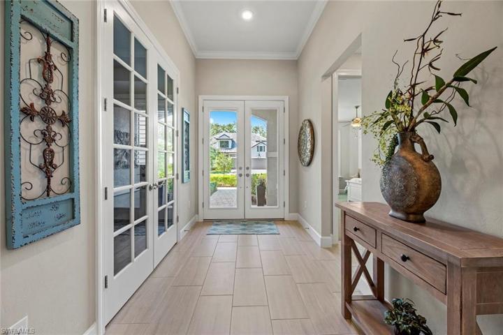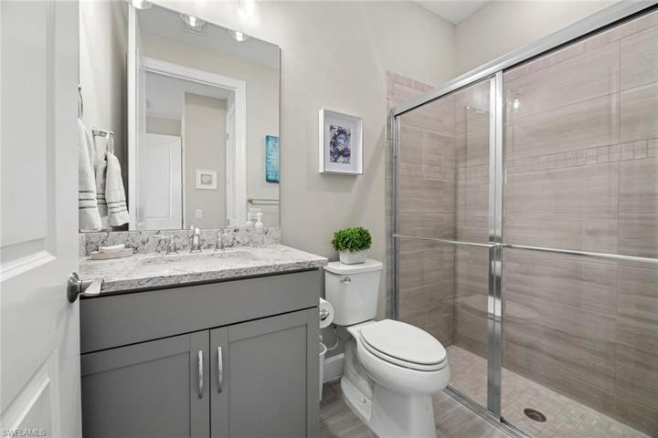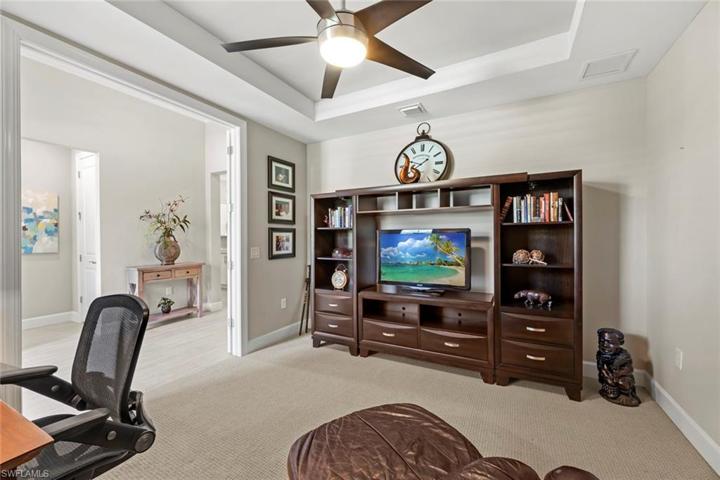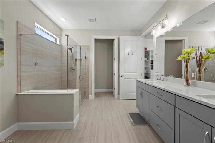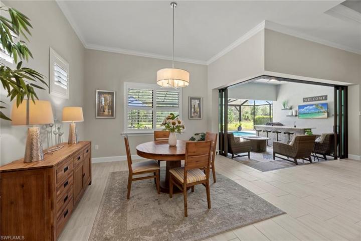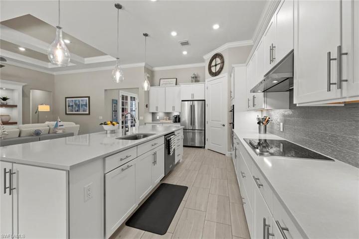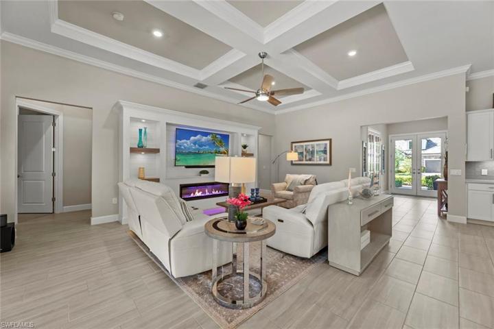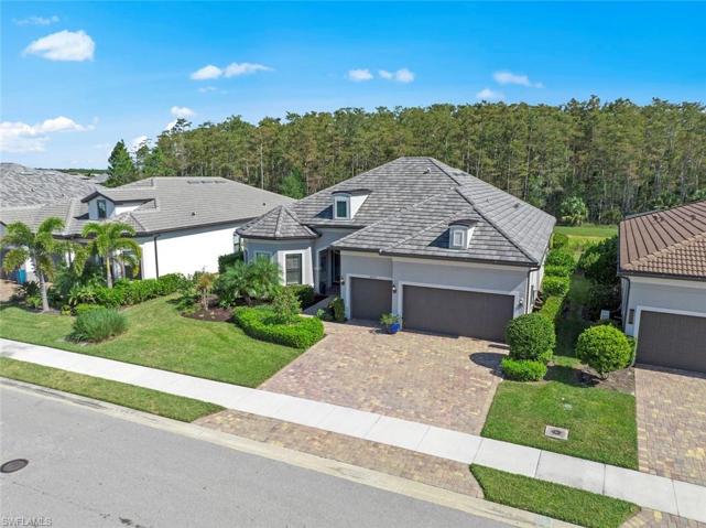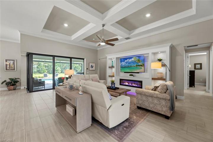 This beautiful open floor plan, 3 bed+den, 3 bath home can be yours located in upscale, Coastal-themed Corkscrew Shores in Estero with its’ spectacular large lake and NO CDD! No expense spared with many upgraded features throughout! Crown molding, coffer ceilings, wood plank tile, zero corner sliders, plantation shutters, impact glass, extended patio. Entertain your guests in the upgraded gourmet kitchen with built-in appliances, quartz countertops, glass backsplash, oversize island with pendants. Guests will enjoy GR with a built-in entertainment center and relaxing fireplace. Step out to the paver lanai with built-in kitchen/bar, custom pool/spa with sun shelf and bubbler and multicolored LED lights to set the mood. Picture window Lanai screen frames the awesome view of nature preserve and pond, plus Storm Smart screen on the lanai. Split bedrooms with large en-suite master and one of the guest bedrooms en-suite. 3-car garage with additional 4 feet, is a man’s dream with washtub, storage units, EV outlet, epoxy floor, and motion detector lights. Clubhouse with huge resort pool offers restaurant & bar plus all the amenities including popular pickle ball!