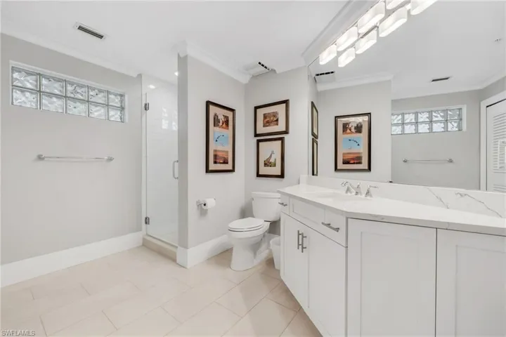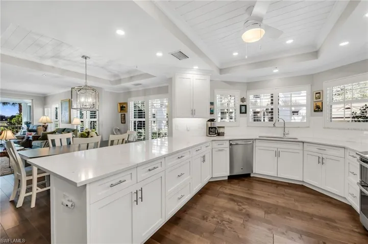 Beautifully renovated and thoughtfully curated, this 3-bedroom, 3-bath residence in the sought-after Waterford neighborhood of Bonita Bay offers a rare blend of refined style and effortless, nature-infused living. From the moment you enter, warm wood flooring, plantation shutters, and a sophisticated shiplap ceiling accent create an inviting atmosphere that feels both elevated and deeply comforting. Sunlight pours through the main living spaces, drawing your eye to the home’s defining feature: a million-dollar lake and golf course panorama overlooking the 17th hole of the Creekside course. This sweeping view becomes the backdrop to quiet mornings, relaxed evenings, and every moment in between—an ever-changing canvas of emerald fairways and shimmering water. The beautifully updated kitchen features quartz countertops, stainless steel appliances, and clean, modern finishes that make everyday living feel luxurious. Each of the three stylishly redesigned bathrooms showcases contemporary tilework and spa-inspired details, adding a sense of calm and refinement throughout the home. The serene owner’s suite offers peaceful views and a beautifully updated bath, while two additional guest suites provide comfort and privacy for visiting family and friends. A rare luxury in condo living, the oversized two-car garage includes abundant storage and a dedicated workstation, ideal for hobbies, projects, or organization. Set within the lush, amenity-rich world of Bonita Bay, this home offers more than a place to live—it offers a lifestyle. Miles of walking trails, a private beach park, a full-service marina, and optional membership to world-class golf, tennis, pickleball, and fitness facilities create a daily rhythm that feels elevated, active, and endlessly inspiring. A beautifully renovated home with a view that truly sets it apart—this is Waterford at its finest, where beauty meets ease and every day feels a little more like the life you’ve been dreaming of.