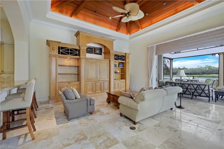 H14013 Spectacular London Bay Estate Home, One of only 9 homes in Quail West with no mandatory club membership (Golf or Social) Enjoy the best views in Quail West overlooking two adjacent fairways with a pond with water fountain in between and the preserve far off in the distance, A masterpiece in design this home certainly has more natural light by far than any you will find! This home features a two story groin vaulted entrance foyer, as well the kitchen, great room, office, primary bedroom, and main hallway also have special ceiling details, ceilings throughout are 12.5 feet plus. The travertine floors are artisan level in their design and execution, the bedrooms feature newly installed super wide plank hardwood floors. Outside you will find a large screened lanai overlooking a completely new 20×35′ heated salt water pool and spa with very large paved fenced area. Additional recent improvements are new flat tile roof and newly painted exterior (both done Fall 2023) Offered fully furnished. Priced to sell immediately! Membership is optional!