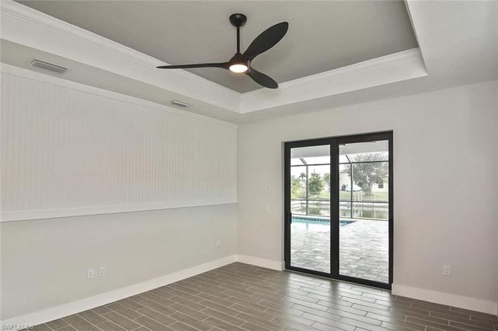 This Southern Exposure Fresh Water New Construction pool home offers a 3-car garage, 3 beds, 2 baths, and a Den. The open kitchen features sparkling white quartz, a walk-up bar, and a separate breakfast nook overlooking the back lanai and pool area. Throughout the home, there is plank tile flooring. The master suite includes a tray ceiling feature, and the master bath is spacious with double sinks, his and hers walk-in closets, a large walk-in rain shower, and a slider entry to the back lanai and pool. The details of this home include 12′ ceilings in the great room with double tray ceilings and 8′ doors throughout. All doors and windows are hurricane impact resistant, ensuring safety during storms. This home offers significant curb appeal with dimensional shingles and a plush landscape package. The back area provides ample outdoor space for relaxing and entertaining, with decorative lanai pavers and a pool bath that leads to the interior of the home. Additionally, this incredible freshwater system allows easy access to a network of interconnected lakes, including Alhambra, Kennedy, Saratoga, and the Shamrock Lakes.
