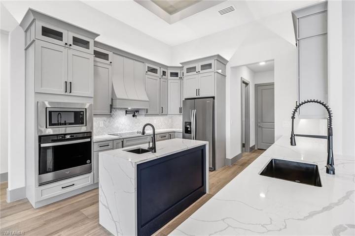 Resort luxury is in your own backyard overlooking your custom pool/hot tub on this wide GULF ACCESS canal. As you enter this “Monaco Sterling” model, you are welcomed to a large great room with tall tray ceilings, custom gourmet kitchen with pot filler, waterfall quartz countertop, and beautiful custom cabinetry! Tile + Hurricane Impact Windows & Doors Throughout (no shutters!)! Spray Foam Insulation! Your EXPANSIVE lanai features a custom outdoor kitchen with hood, tray ceilings, and a pool bath! The salt water pool features a hot tub with w/ 360 waterfall, sunshelf w/bubbler, and an electric heater! Roughly 30 minutes before you’re out to open water. This exceptional property offers family and friends the ultimate Florida lifestyle. Tongue and Groove in the lanai tray ceilings!* Spec sheet available upon request! Inquire for more details!