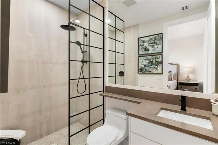The penthouse offers three generously sized bedrooms, including two king suites and a guest room with two queen beds, and three and a half baths. The primary bath features porcelain tile flooring and a custom rain shower with ADA-friendly thresholds. The powder bath showcases an inlaid marble mosaic wall and sculptural soapstone sink.