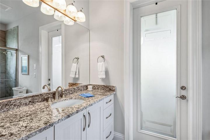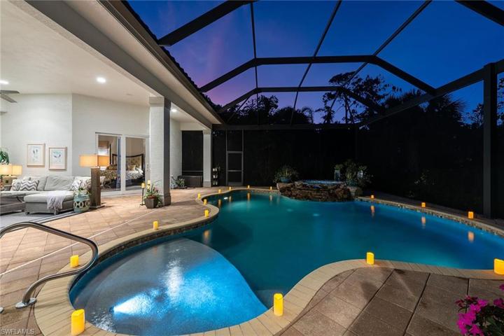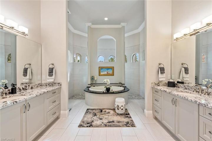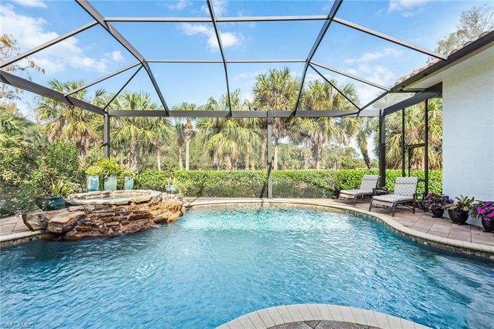 Stunning custom estate in the desirable Classics neighborhood in award-winning Lely Resort. This remarkable quality-built and immaculately maintained residence features four bedrooms plus study and recreation room, five baths, three-car garage and breathtaking golf views. Upon entering the dramatic front doors, you’re welcomed by impressive 14-foot tray and coffered ceilings with crown molding and indirect lighting, plantation shutters, floor-to-ceiling sliders and wood-like tile flooring. The gourmet kitchen is equipped with gas cooking, Viking appliances, premium cabinets with pull-outs and soft-close, and granite countertops. The impressive outdoors features a heated lagoon-style pool with spa in a picture-window screen enclosure offering extraordinary views, enhanced by a gas fireplace and outdoor kitchen. Upstairs is a versatile bonus room complete with kitchenette and bath. Other features include impact glass, custom closets, built-ins, wine chiller, Sonos, new 24-kilowatt home generator, electric shades, security, central vacuum, ample storage, and a three-car garage with epoxy floor and built-ins. Amenities include dining, golf, gym, tennis, pickleball, bocce and dog park.