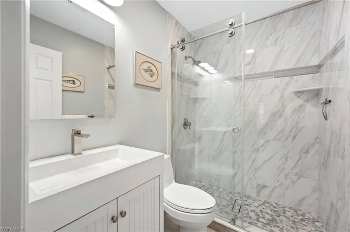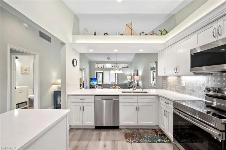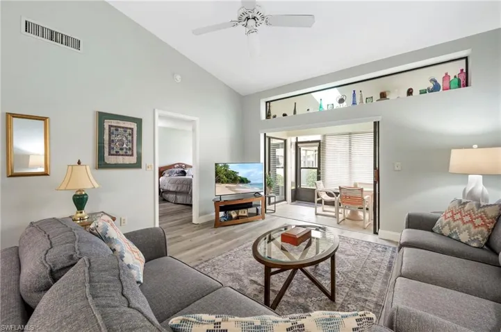 Beautifully maintained pool villa with vaulted ceilings located in a desirable gated community just minutes from Fort Myers Beach and Sanibel Island. This unique corner villa offers exceptional indoor-outdoor living, with a courtyard pool directly accessible from the back door—perfect for relaxing or entertaining. The rear and front lanais are enclosed with sliding windows. Back lanai is thoughtfully furnished with a 4 top table and chairs. At the front of the home, a glassed in lanai is furnished with chairs and side table for a relaxing atmosphere to view the landscape. Inside, the open kitchen features timeless shaker cabinetry, quartz countertops with tile backsplash, stainless steel appliances and lighting. Updated bathrooms include modern cabinetry, solid-surface countertops, mirrors, and lighting. Additional upgrades include two updated showers, custom window treatments, and tasteful furnishings that elevate comfort and style throughout the home. Primary bedroom features bay window area. The laundry room is located inside the villa. Residents enjoy resort-style amenities at the main clubhouse, including a fitness center, pool aerobics, tennis, pickleball, shuffleboard, bocce ball, and more.