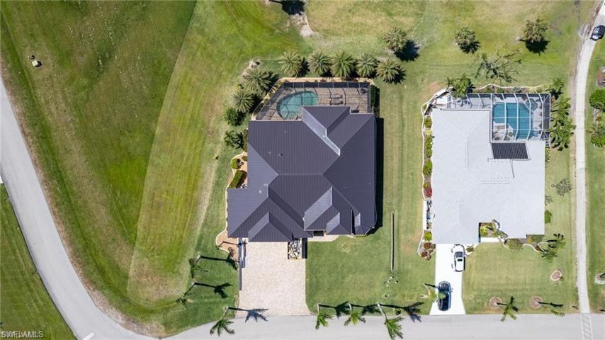 Golf and Gulf! Enjoy the best of both worlds: Golf on the 27 hole Cape Royal golf course, or boat from the nearby boat ramp. The expanded 4-car garage of this custom home allows room for cars, boats, trailers, hobbies, with a 220 outlet for charging electric vehicles. Entering this meticulously kept home, you will notice soaring ceilings, and gleaming hardwood and travertine floors. The master suite offers his & hers walk in closets with plenty of storage. Entertaining is easy in the spacious kitchen boasting custom wood cabinets, lots of counter space and large island. The open layout allows a perfect flow between the kitchen and expansive family room with coffered ceilings and 10 foot sliders leading to the lanai. Swim in the solar heated pool, or watch a spectacular sunset with golf course views from your western exposure. Hurricane rated doors and windows, new HW & HVAC in 2020, and new metal roof in 2023. Lower taxes in unincorporated Lee County, and lower water bills with Pine Island water. Cape Royal is a beautiful & safe gated community with low HOA fees, many community activities, tennis and pickleball courts, and a clubhouse/dining facility. Furnishings negotiable.