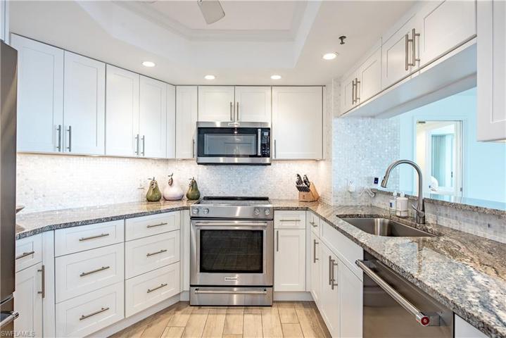 Indulge in the best that the luxurious Naples beachfront lifestyle has to offer. This exquisitely updated, 4th floor, two bedroom, two bath residence provides breathtaking views of the Gulf of Mexico from Naples to Sanibel Island. Enjoy sunsets and warm Gulf breezes from either of the two screened lanais. The open and flowing floorplan offers 1,881 total square feet of perfectly appointed living space with custom finishes and outstanding attention to detail. Additional features include high-end appliances, custom walk-in closets with built-in shelving, a spacious master suite, electric hurricane shutters, impact glass windows, one deeded garage parking space, and extra air-conditioned storage. Vistas at Park Shore is a premier high-rise building with resort style amenities including a large beachside pool and spa, social room, library, fitness center, sauna, steam room, and four guest suites. Steps to Venetian Village & central to all of Naples from the downtown district of 5th Ave S & 3rd St, to Waterside Shops, Artis-Naples & Mercato for upscale dining, shopping & entertainment. Owners at Vistas can also lease or purchase a boat slip in the Venetian Yacht Club.