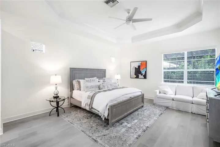 Welcome to this exquisite sanctuary of luxury living! Nestled securely within the confines of a gated community, this remarkable one-story residence effortlessly combines opulence and coziness. Offers a furnished living area and the open floor plan seamlessly connects the living room to a modern, fully equipped kitchen featuring a capacious countertop, making it an ideal canvas for culinary creativity. The master bedroom, in particular, stands out with its capacious walk-in closets and an en-suite bathroom that indulges you with a soaking tub and a separate shower a personal retreat within your own home. When it’s time for outdoor recreation, step into your private backyard oasis, where a glistening pool beckons for relaxation and fun in the sun. For those with a passion for athletic pursuits, the community offers tennis courts, where you can engage in friendly matches with your neighbors, and a playground.