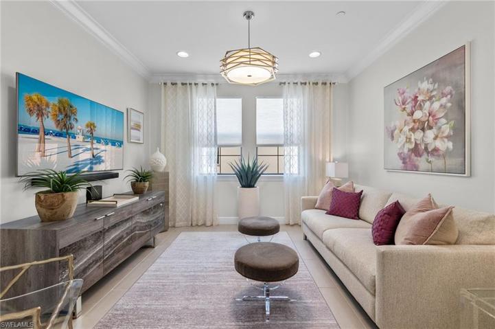 Resplendent in every way! This stunning condo provides unparalleled decor and finishes. The sales price INCLUDES the SPORTS MEMBERSHIP (currently $38,250 and the two resale fees of $5000 each) for additional value to the happy Buyer! The interior provides tile flooring in the living areas with hardwood in the bedrooms, built in cabinets in the primary bath, custom closets throughout, sophisticated furnishings (negotiable), a wine or beverage cooler in the bar area and a fabulous screened loggia with a built in electric fireplace for additional ambiance. Crown molding and custom ceiling trim accentuate the great room/dining area. Natural light is abundant in this treasure! The oversized two car garage provides room for two vehicles and a golf cart and is humidity controlled. A short stroll to the tennis and pickle ball courts, lap pool, bocce courts and “tot lot” make the location enviable. Talis Park affords a lively social calendar, the newly renovated award winning golf course, a beautiful clubhouse with different bar and dining venues, two dog parks, fitness rooms, a spa and a Mercedes Beach Runner! Treat yourself to a preview of this captivating condo!