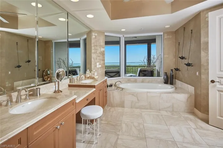 Treviso’s updated common areas feature transitional furnishings and marble floors with views over water features. Three guest suites, an elegant social room, billiards room, theater, and fitness center complete with sauna. Spa and free form pool with graceful beach entry.