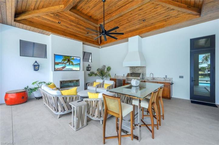 SIMPLY STUNNING! AVOID THE 2 YEAR WAIT FOR A NEW HOME… This Beauty was Custom designed to take in the beautiful wide water views and fabulous Marco sunsets! **Built by Aqua Custom Homes in 2022 **This home truly offers the BEST OF THE BEST! Great Room with 13 ft ceilings- ( linear AC vents) 10Ft sliders with 90 degree disappearing corner.. opens to a HUGE Lanai ( 25 x 25) You won’t find this in most homes!! with fireplace, Gas Lanterns! outdoor kitchen and beautiful stained cypress ceiling detail.. complete with Roll down bug screens and Hurricane shutters to close in the space when needed. **PLENTY OF PREP SPACE . Kitchen with 12 ft long island- and beautiful stone countertop custom 4 FT GALLEY sink ( 2 faucets plus filtered drinking water ) 48” WOLF gas pro range ( double ovens) 48” pro SUB ZERO fridge- custom finished walk in pantry with ice maker and WOLF microwave. A Wine and Bourbon cellar with lighting, a dedicated cooling unit and remote operation. window shades are motorized for convenience- pool and spa equipment operated by either the Aqua Link or remotely via IAqua app. 2 Zoned AC units..