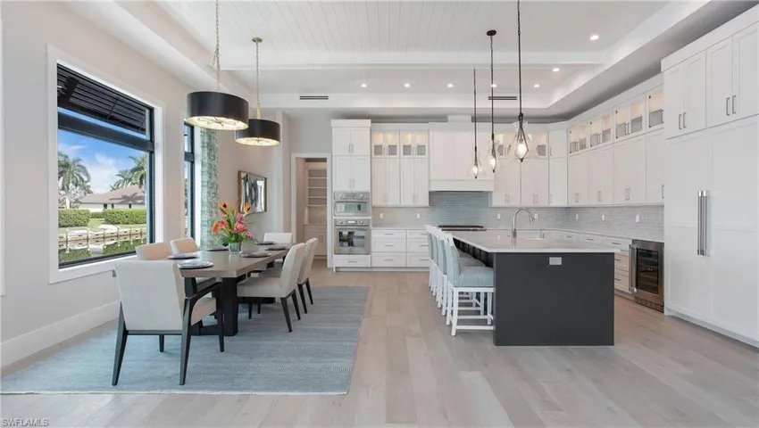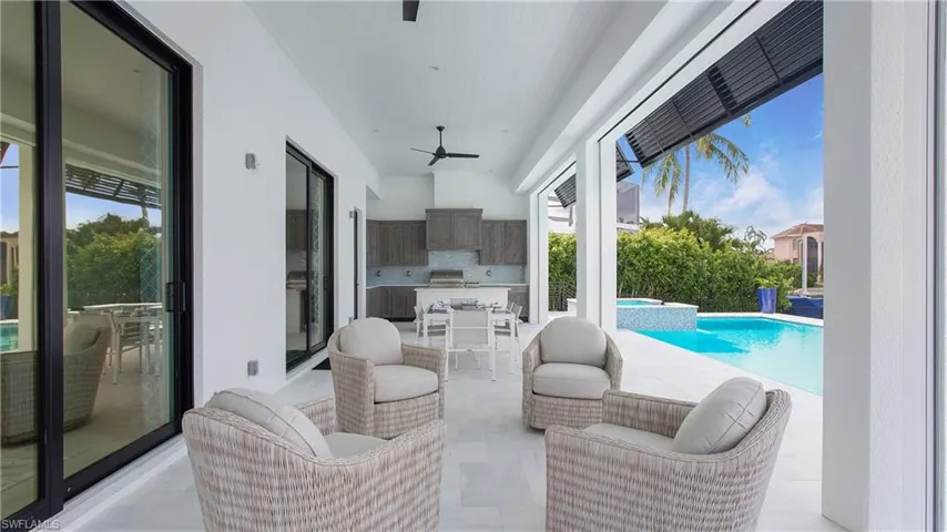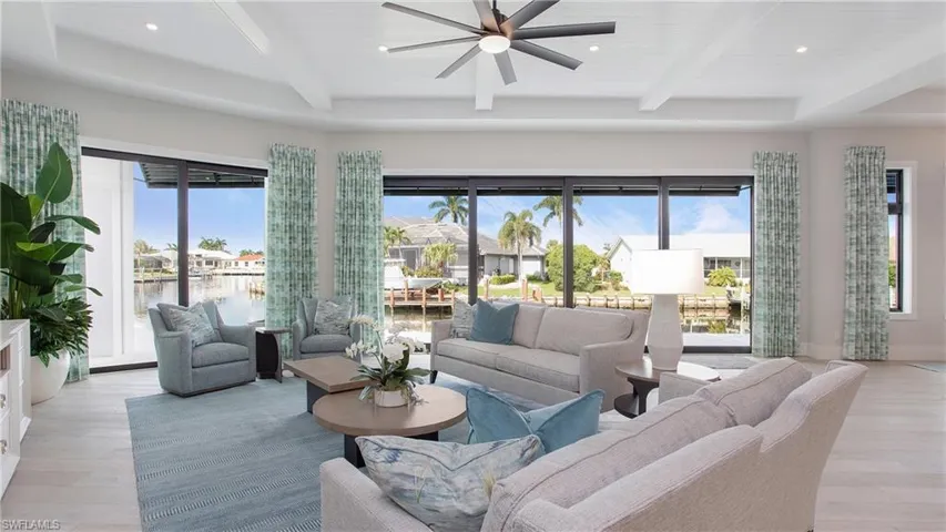 This elegant waterfront estate offers professionally designed luxury including a 4 car garage, 207′ new seawall, and wide water views. With Southwest exposure and direct access to the Marco River, this home is a boaters dream. This family estate offers a large kitchen complete with custom Amish cabinetry and featuring stainless steel Thermadore appliances, including a professional gas range, and butler’s pantry. Tucked away from the main living area is the master suite and luxurious bath, with walk through shower and massive custom closet. Also on the main floor is the unique casita living space for guests with a private entrance and en suite bathroom. Enjoy the water views on the second floor of this residence from the expansive terrace outside. Inside you will find a large family room with 3 additional bedrooms and 2 bathrooms. Delight in the alluring water views and magnificent sunsets from your heated pool and spa, the lanai, and the large covered living area. An outdoor kitchen, electric shutters and screens will enhance your outside living experience. Completion date April 25, 2024. Decorator furnishings included.