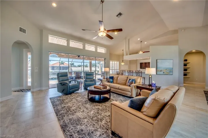 Stunning SW gulf access furnished pool home with a tranquil backyard paradise in the desirable Cape Harbour area with stunning sunsets! This waterfront home was designed to emphasize indoor and outdoor living. The open kitchen, dining/living areas & 2 master suites all share breathtaking water views! This 5 bedroom with 4 having ensuite bathrooms, while the 5th bedroom can serve as a fabulous office/den or fun game room with French doors & closet plus an oversized 3 car garage with no expense spared, is ready for immediate occupancy. Indulge your culinary senses in the beautifully designed Kitchen. Quartz countertops showcase stainless steel appliances, custom cabinets, breakfast bar, an Island plus a large walk-in pantry. There is beautiful tile & wood flooring throughout the home, no carpet. The owners’ suite is a true haven, featuring a generously sized elegant master bedroom with a tray ceiling, dual large walk-in closets, and an ensuite bathroom equipped with a relaxing soaking tub and a walk-in shower. There is a secondary master as well with tray ceilings, sliders to the lanai, and attached bathroom with walk-in shower. In 2023 new wood dock decking, canopy above boat & new pool screens. The charm continues as you step outside the sliding glass doors to a beautiful patio with remote hurricane shades, sparkling pool with new Resilia rubberized pool deck, waterfall feature, spa & a remodeled (2022) complete summer kitchen under a tiki hut, all overlooking a 150′ wide canal creating a perfect setting for waterfront enjoyment. This home has a private dock, boat lift, captains walk, newer hurricane front door, Tile Roof was just completely cleaned, circular paver driveway and amazing curb appeal! New washer & dryer in 2023, New pool pump in 2022 & both A/C units are newer (2021 & 2020). Perfect also, for a successful VACATION RENTAL! This home has everything you’re looking for all just a bike ride away from Cape Harbour or you are close enough to walk to nearby shopping & amazing restaurants! Boat to nearby eateries or the areas award winning beaches of Sanibel, Captiva & Ft Myers Beach. Superb Neighborhood! A lot of attention to detail went into the construction of this property and the homeowners have been taking excellent care of the home! NO FLOODING! Incredible lot! Please check out Virtual Tour!