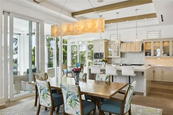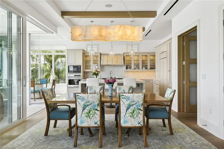 Have it all! Waterfront with two boat slips, private pool, four-car garage and gated association beach access. Close to the magnificent Four Seasons Resort and residences. Glass walls and multiple balconies provide spectacular views from one of only two water-side end residences. Built by BCB Homes, it features an open floor plan with 12-foot ceilings. The room sizes are generous with the living room, gourmet kitchen and dining spaces flowing out to a large, covered terrace that overlooks the waterfront and pool. The updated kitchen, with white quartzite countertops and top-of-the-line appliances, should suit the most epicurean-oriented homeowner. For entertainment there’s an expansive covered lanai and pool area with an outdoor kitchen framed with quartzite slab. Four-bedroom plus den, 5 ½-bath with its elevator. Just minutes from the finest shopping and dining experiences Naples has to offer.