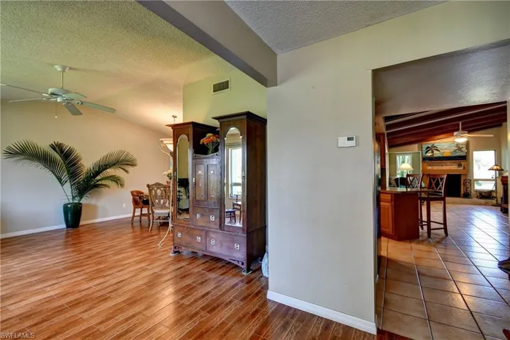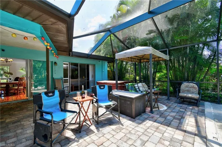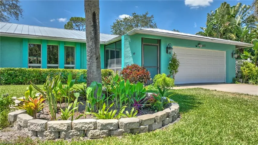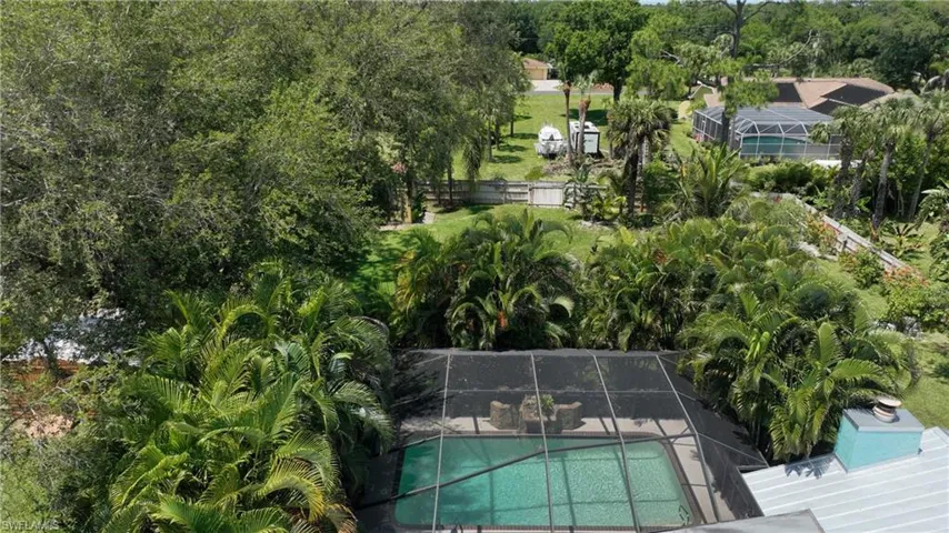 But the real story is your private backyard: concrete pool with waterfall fully screened (2018), covered hot tub (2023) and covered swing stay, stockade fence for privacy on this 1/2-acre lot, paved beer garden, raised flowerbeds, 10X12 shed, and fruit trees (mango, banana, coconut, lemon, lime, grapefruit, tangerine & sapodilla). The raised garden beds and lush landscaping create your own backyard paradise. Deep well with 4 zone irrigation system keeps it growing.