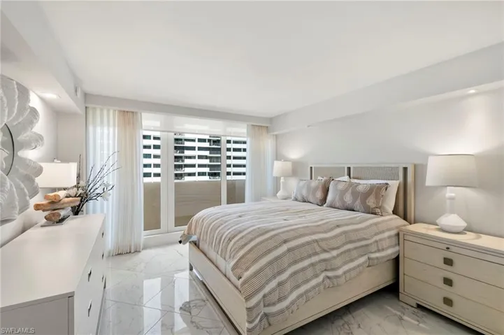European distressed marble flooring runs throughout the residence, complemented by custom lighting that adds warmth and sophistication. Step onto your private balcony to enjoy sweeping coastal views stretching north toward Sanibel Island while relaxing to the peaceful sound of waves along the shore.