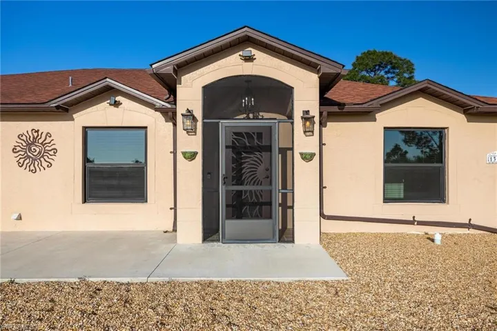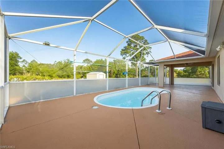Ready to move in! This gorgeous house is on 1/2 acre in a quiet neighborhood. 3 bedroom/2 full bathrooms. Master Bedroom with walk-in cedar closet, double sinks, 7ft Jacuzzi tub, and custom door that leads to outdoor pool area. Second bathroom with 7ft soaking tub. Open floor plan with vaulted ceilings and recess lighting. Large kitchen with granite countertops, double oven and new appliances. Beautiful travertine flooring throughout the home with ceiling fans in every room. The owner has made many upgrades including, Florida certified hurricane rated windows and sliding doors, reverse osmosis water system through the entire house w/ maintenance contract, hard-wired ring security system, gated security cage for outdoor water systems, NEMA 5-20 outlet and switch generator connection, 80 gallon water heater w/ 5 year maintenance contract, covered swimming pool with outdoor shower, separate porch with fan and lighting, custom exterior doors, and 20×12 outdoor storage shed. Appliances included along with washer/dryer.