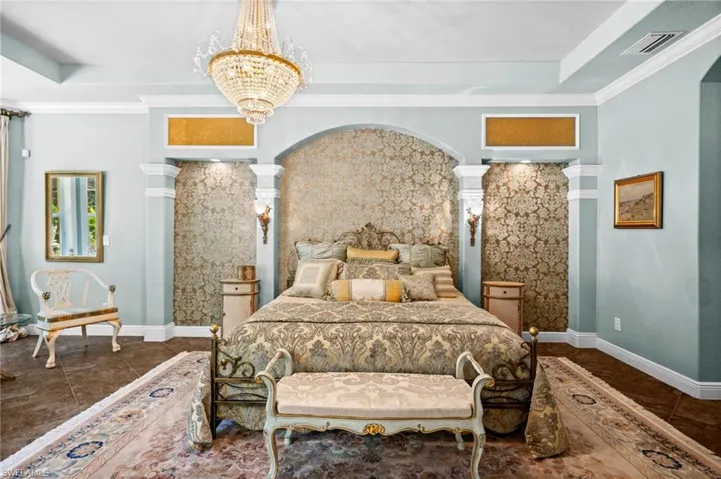 Step outdoors and the experience continues. Framed by matching brick pavers, lush privacy, and timeless architectural elements, the outdoor living space evokes a private Tuscan villa. A spectacular pool with fountain features, expansive screened lanai, and fully equipped summer kitchen create a resort-inspired setting ideal for entertaining or quiet relaxation. It is a setting as beautiful as it is serene.
