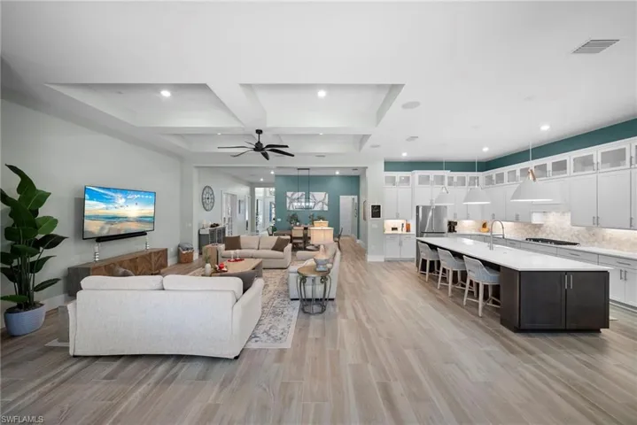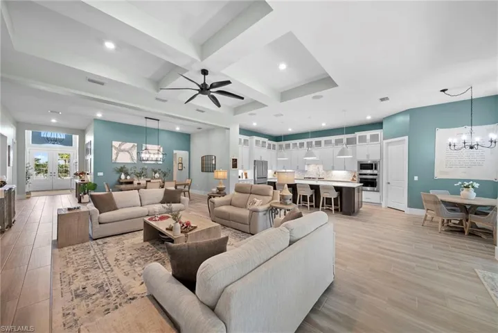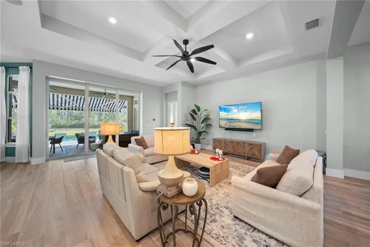 Inside, wood-plank tile flooring flows throughout the main living areas, complemented by a soothing nature-inspired palette. The great room is elevated by a coffered ceiling and abundant natural light, while French doors open to a versatile den ideal for a home office, media room, or quiet retreat.