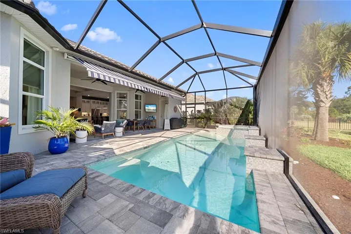 The home embraces a refined modern organic aesthetic where clean architectural lines, warm natural tones, and expansive windows create a seamless connection between indoor living and the surrounding landscape. A picture-frame screen enclosure preserves uninterrupted preserve views while enhancing the sense of openness and tranquility.