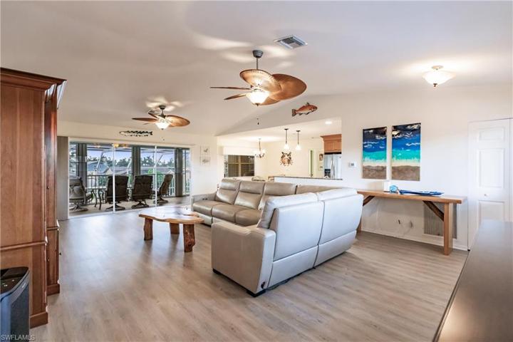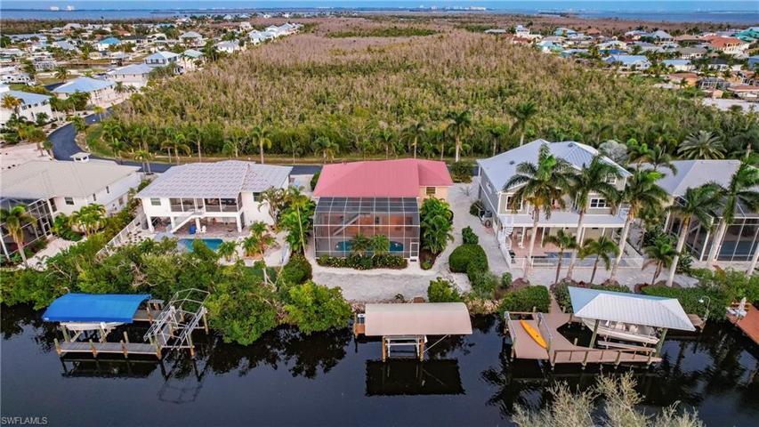A BOATERS DREAM! This updated POOL home is just minutes to open water-NO BRIDGES. View the private preserve out front with its flora and fauna, & the island sunset views across your pool & dock. Enjoy the peaceful patio and low maintenance coastal style backyard with a shell gravel yard & beautiful palms, hibiscus & plumeria. Or by the oversized heated pool while viewing the boat sitting on your dock with a covered boat lift & fish cleaning station. Like to tinker? This garage of ~1700 sq ft of parking, storage, & workshop. The inside is just as beautiful with luxury vinyl (LVP) throughout the entire home. An open kitchen overlooks the oversized living room & dining room which makes entertaining a breeze, and laundry upstairs makes chores a snap. Relish island winds by opening the living room triple slider to the two-story screened lanai. Private master suite features a walk-in closet & private bath with walk-in shower, dual sinks, a private toilet room, & vanity. 2 bedrooms with a hall bath give privacy. 1 bedroom includes a slider to the deck. Leave that car & ride your golf cart to all of your island favorites. Low flood ins. can be transferred! Don’t miss the 3D walkthrough!
