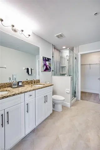 The primary suite offers preserve views, a tray ceiling, ceiling fan, and an en-suite bath with dual sinks, a tiled seamless glass shower, updated cabinetry, and a walk-in closet.