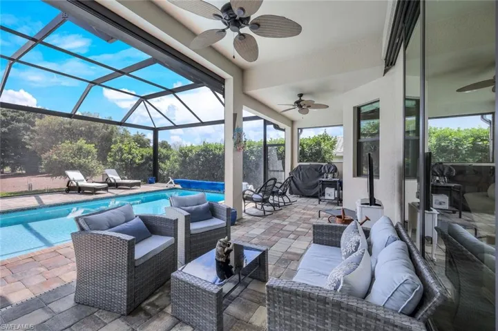 This stunning south-facing home combines luxury, efficiency, and resilience. Enjoy Marco Island’s sunny days with expansive pool and lanai views, sheltered by impact-resistant lanai shutters for peace of mind. Durable tile plank floors create a cohesive feel throughout the home. The gourmet kitchen features a convenient pot filler and ample pantry space, and a gas stove for serious cooks. Cool off in the sparkling saltwater pool – with a new (2024) heater for year-round enjoyment. Relax knowing whole-house solar and a solar battery pad offer potential energy independence. The home even includes an EV charger (negotiable) and a spacious two-car garage with a convenient extra refrigerator. The serene primary bedroom features elegant plantation shutters, offering privacy and light control. Unwind in the luxurious ensuite. This home’s private, panoramic screened views offer a tranquil escape. Built with impact glass and a gas hookup, it’s ready to weather any storm while offering the best in Florida living.