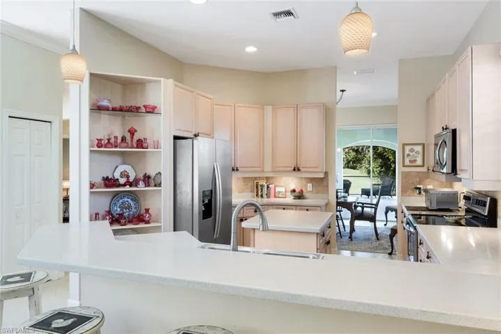 Inside, the home features both a formal living room and a spacious family room, creating a warm and inviting flow ideal for everyday living or hosting guests. The kitchen is thoughtfully designed with a center island and abundant cabinet space, offering both functionality and storage while serving as a natural gathering place for family and friends. Plantation shutters throughout add timeless elegance while enhancing privacy and natural light control, complementing the home’s relaxed yet refined ambiance. What truly sets this property apart is its exceptional outdoor living, with a combined 1,642 square feet of screened space thoughtfully divided between TWO distinct lanais, creating multiple areas to relax and entertain. The expansive rear lanai overlooks Windstar’s 6th hole and green, along with the 7th tee box, offering peaceful, panoramic golf course views and a serene backdrop for morning coffee or sunset evenings. A separate screened courtyard lanai provides a second private retreat, complete with a heated pool, spa, generous lounging and dining areas, and an outdoor wet bar, delivering a true resort-style experience right at home. Residents of Windstar on Naples Bay enjoy access to a Tom Fazio-designed championship golf course, a private deepwater marina with direct Gulf access, and a private beach club on Keewaydin Island accessible via the community’s exclusive boat shuttle. Additional amenities include tennis, a state-of-the-art fitness center, waterfront dining, and a vibrant social scene, all just minutes from downtown Naples, world-class shopping, dining, and white sand beaches. Just outside Windstar’s gates, the vibrant Bayshore Arts District offers a dynamic mix of culture, dining, and outdoor living. Enjoy easy access to the Naples Botanical Garden, the USOP National Pickleball Center, and a growing collection of local restaurants and waterfront dining. The newly completed boardwalk connecting the district to Sugden Regional Park enhances walkability with scenic waterfront trails and recreational spaces, perfectly complementing the Naples lifestyle.