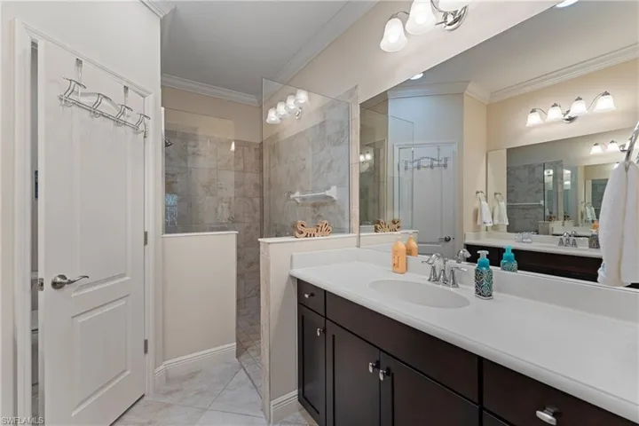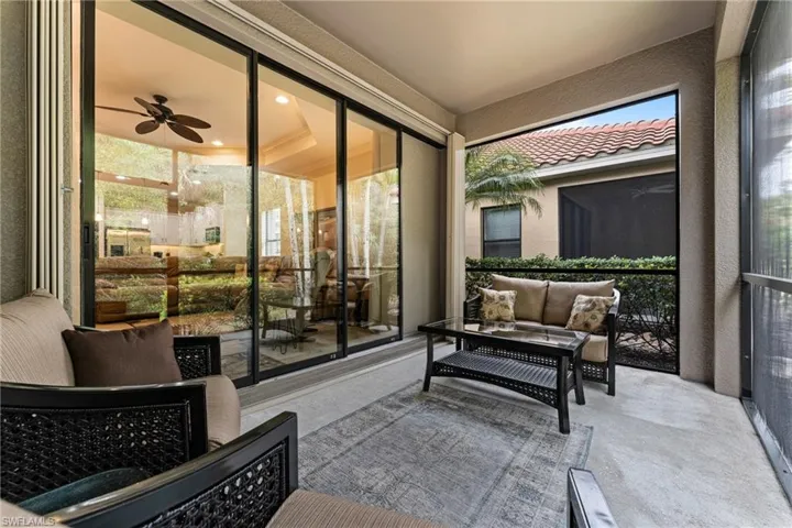 The primary suite includes a spacious walk-in closet with custom built-ins and a well-appointed bath with dual sinks. Step outside to the screened lanai overlooking a private preserve, offering peaceful mornings and shaded afternoons.