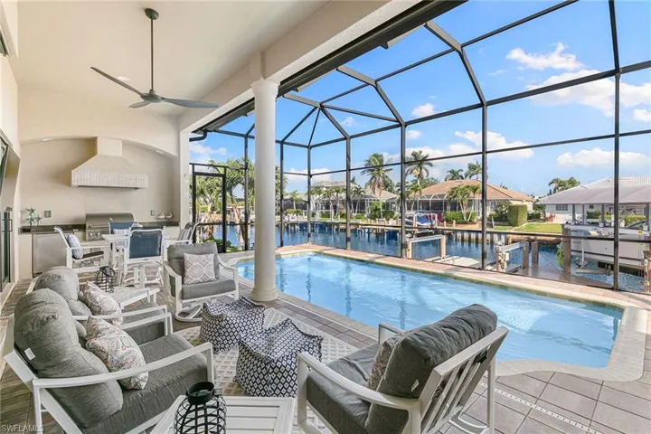 Positioned along 80 feet of waterfront with a 2013 seawall and indirect Gulf access, this impeccably maintained 2013 Divco-built residence offers a rare blend of craftsmanship and coastal functionality. A 13,000-pound boat lift, installed in 2023 and fitted with a 2025 cover, is complemented by additional dockage designed for wave runners, an ideal setup for boating enthusiasts. The interiors are thoughtfully planned, featuring four bedrooms and three baths, with one bedroom serving as a den. The kitchen was upgraded in 2024 with quartz countertops, a matching backsplash, handcrafted cabinetry, stainless steel appliances and coffered ceilings. The primary suite is appointed with a hotel-inspired bath, while a new air-conditioning system installed in 2023 adds comfort throughout. Sliding glass doors open to a screened paver lanai with a summer kitchen and a generously sized pool, offering seamless indoor-outdoor living. Impact-resistant glass, epoxy-finished garage flooring, tasteful décor and full furnishings complete this move-in-ready offering. Conveniently near local schools and the YMCA. 2024 taxes shown reflect the home and the neighboring vacant lot (1540 Kingston Court) combined.