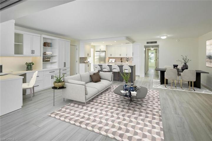 It’s all about the waterfront location and water views. Rarely available, completely remodeled and updated 2-bedroom/2-bathroom first-floor end unit on Moorings Bay with southern exposure. Very flexible great room plan extending into the glass-enclosed lanai. Lots of new built-ins in great room corner, ideal for working from home. Open, redone kitchen with brand-new high-end appliances, countertops cabinets and backsplash. The owner’s suite has two windows, a large walk-in closet and a wonderful bathroom. Large guest bedroom, in-residence walk-in laundry room with extra storage. Located in a small enclave of only 24 residences situated within a beautiful, tropical landscape setting featuring a large community bayfront pool, tiki hut and boat docks. Docks are available for lease at $550 a year, can accommodate up to a 35’ (max) boat and offer direct access to the Gulf. Conveniently located near shopping, restaurants, the beach and downtown Naples.