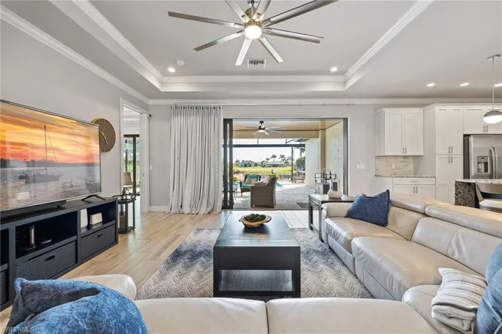 Enjoy finishes like tile flooring throughout, crown molding, tray ceilings, impact doors and windows, and an added benefit, a whole-house reverse osmosis system. The open great room flows seamlessly to a screened lanai with a wood-inlaid ceiling, a panoramic pool cage with super screen, and a sparkling pool—your private oasis for entertaining or relaxing in the sun.