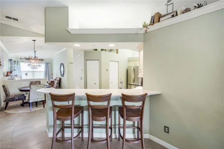 Beautifully maintained and move-in ready, this second-floor condominium offers the perfect blend of comfort, style, and Southwest Florida charm, ideal for year-round living or a relaxing seasonal retreat. This inviting 2-bedroom plus den/flex space, 2-bath home has impact windows and sliders throughout and is thoughtfully designed for effortless living, featuring stunning tile flooring throughout the main living areas and bathrooms, complemented by plush carpeting in the bedrooms. Filled with natural light, the home showcases breathtaking lake and fountain views and is conveniently located just steps from one of the community’s five pools and nearby guest parking. The well-appointed kitchen is both functional and stylish, offering a farmhouse sink, GE PROFILE stainless steel appliances, CUSTOM solid wood cabinetry, quartz countertops, a taupe color glass backsplash, and additional space for casual dining, all opening seamlessly to a bright and airy living area enhanced by volume ceilings, crown molding and sliding glass doors leading to the IMPACT GLASS-in lanai—perfect for enjoying peaceful water views and gentle Florida breezes. The primary suite serves as a private retreat with lanai access, a spacious walk-in closet, and an updated en-suite bath featuring dual sinks, granite countertops, a modern vanity, and a walk-in shower. The front of the residence provides privacy for guests with a comfortable second bedroom, a full guest bath, and a conveniently located laundry closet, while the versatile den/flex room is ideal for a home office, reading nook, or media space. Located within the gated community of Lighthouse Bay, residents enjoy an exceptional resort-style lifestyle with access to five swimming pools, including a lap pool, 2.5 miles of scenic walking and jogging paths, bocce, tennis courts with a pro on staff, pickleball, two boat houses, a fitness center, sauna, clubhouse, library, and an Arts & Learning Center, making this home a wonderful opportunity to experience the best of Southwest Florida living.