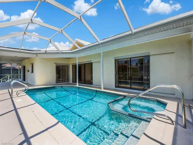 Tucked away on a quiet cul-de-sac in one of Marco Island’s most desirable neighborhoods, this waterfront gem offers the perfect blend of comfort, space, and Southwest Florida lifestyle. This light-filled residence features an open-concept layout, high ceilings, and large sliding glass doors that seamlessly connect indoor and outdoor living. The heart of the home is the expansive screened lanai, complete with a sparkling pool and spa—ideal for lounging in the sun, enjoying alfresco meals, or simply unwinding in the tranquil setting. Wake up each day in the massively oversized primary suite with direct access to the pool and serene canal views with over 140ft of seawall. The large kitchen opens to both the living and dining areas, making entertaining a breeze. The layout provides privacy for all, with multiple guest rooms, spacious powder room and versatile spaces to meet a variety of needs. Recent improvements include new HVAC, water heater and flooring. For boating enthusiasts there are two options, a 10X12 platform at the corner of the lot and a private dock with boat lift, both offer quick access to the canal, making this home a dream come true for navigating the island’s waterways or venturing out to the Gulf. The oversized lot allows for room expand, a new fire pit or whatever else you can imagine in the space. The lush tropical landscaping, and peaceful setting make this property feel like your own personal retreat—yet you’re still just minutes from the island’s top dining, shopping, and beaches. Whether you’re searching for a full-time residence, seasonal escape, or investment opportunity, this waterfront home delivers location, lifestyle, and leisure in perfect harmony.