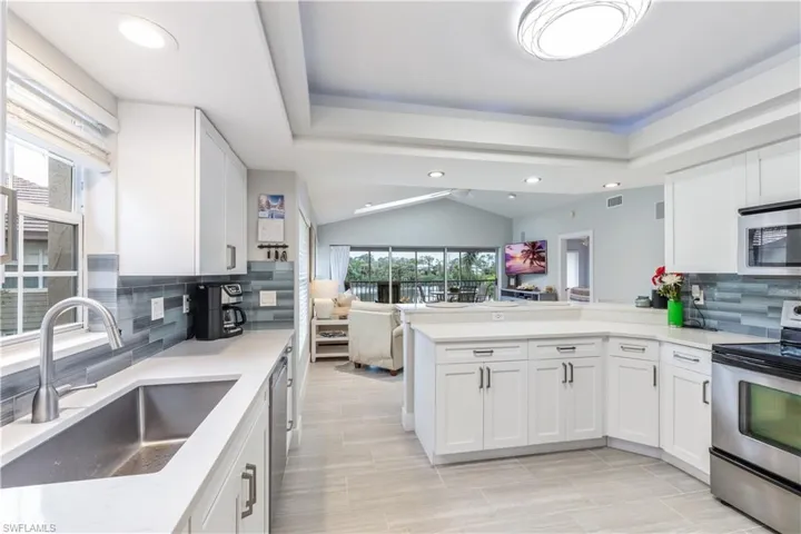 C13734 ONE OF THE MOST BEAUTIFUL LAKE VIEWS IN BONITA BAY……Bright and sunny coach home with brand new AC/HVAC system and new tile flooring throughout. This second level, open floor plan features updates with an inspiring coastal design. Lots of windows providing natural light, new light fixtures and recently painted interior walls and baseboards are just a few highlights this end unit has to offer. Kitchen boasts new white cabinets, beautiful new quartz counter tops and backsplash, stainless steel appliances, wine cooler, new sink and faucet + breakfast bar seating perfect for enjoying your favorite beverage. Both baths have been beautifully renovated as well. Coveted 2-car garage has new epoxy flooring, new paint and new garage door opener plus new screening installed on the southern facing lanai. Truly a coastal get-a-way you’ll love coming home to.