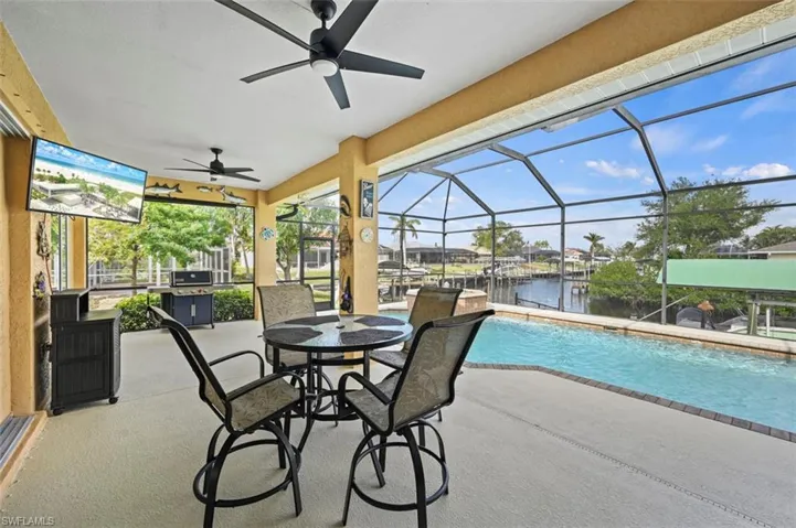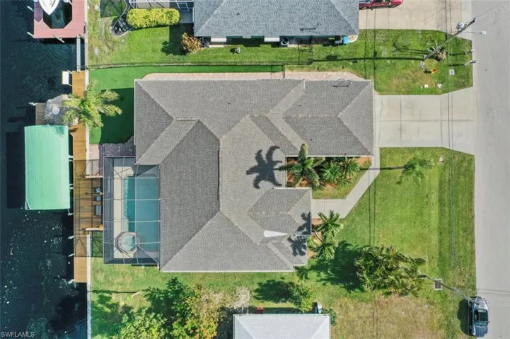 BOATER’S DELIGHT, NEVER FLOODED! This beautiful GULF ACCESS POOL HOME with a NEW ROOF (2023) is waiting for its new owner. French door entry welcomes you inside to find 4 bedrooms and 2 bathrooms set amongst 2,354 square feet of thoughtfully designed living space with 10’ ceilings built by Marvin Homes. The remodeled kitchen features rich, wood cabinetry, granite counters, stainless steel appliances and a breakfast bar. A spacious primary bedroom features plantation shutters, 2 walk-in closets and a large en-suite bath. Stunning views can be found at every turn with an abundance of sliders and windows that fill the home with tons of natural light. Outdoors, an expansive screened lanai is complete with an in-ground, heated pool and spa with automation. A paver walkway and Astroturf landscaping lead you to the wooden dock with 8,000 lb. BOAT LIFT and electric, fish cleaning station and TIKI HUT with TV for the ultimate entertainment space. Impact windows and manual hurricane shutters throughout plus an oversized garage 3′ deeper for extra storage. Located just off Veterans Memorial Pkwy for quick access to the rest of Cape Coral, Fort Myers, and the best that Southwest Florida has to offer!