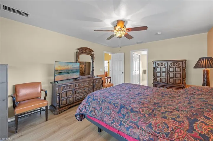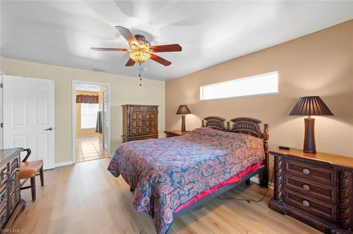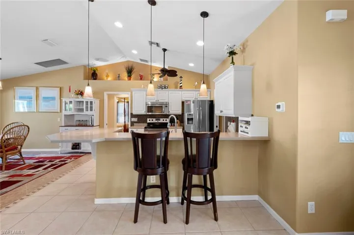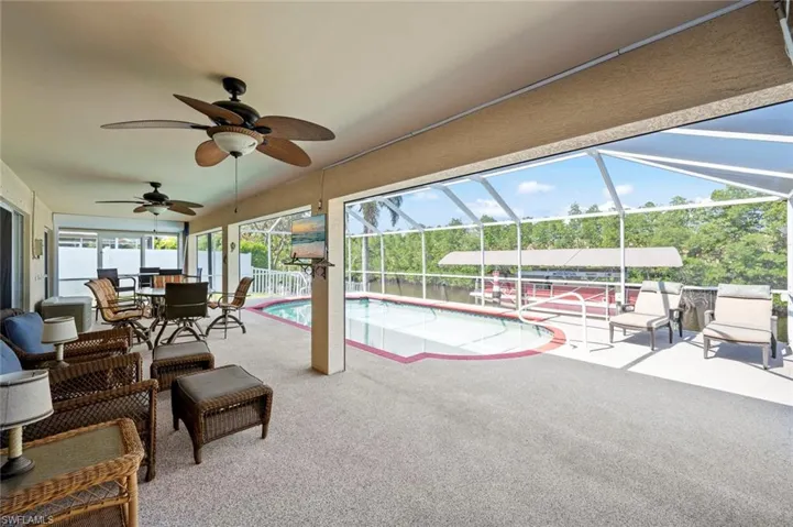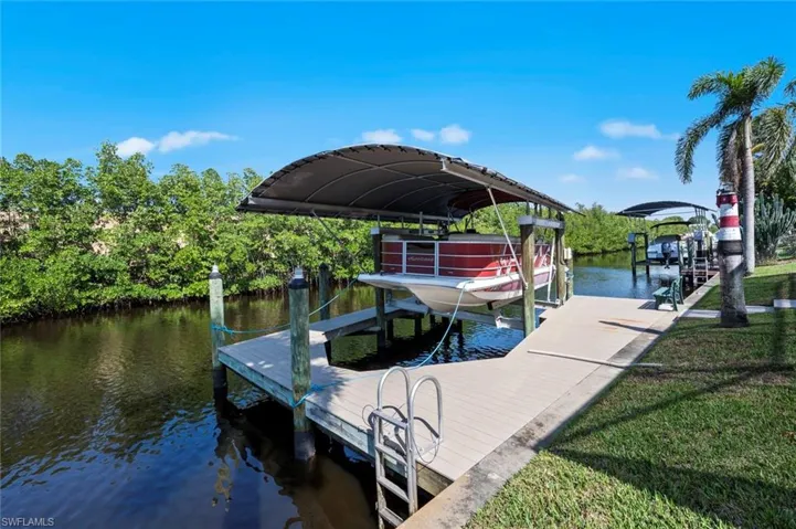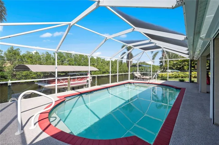 PRICED UNDER 600K for this ,Direct Sailboat Gulf Access ,3 bedrooms, 2 bathrooms, split floor plan with a Great Room design. Triple Sliders and Double Sliders lead to the oversized screened lanai and pool. Private mangroves in the back, watch dolphins, manatees and other sea life. Boat dock installed in 2017 that includes a wrap around deck and 14,000 lb lift and canopy. New Roof in 2019, Electric Hurricane Shutters in 2022, new a/c 2018 and hot water heater in 2020. all assessments PAID. Cathedral ceilings, solid surface counter tops, tile on the diagonal, new luxury wood like flooring in bedrooms in 2022, the rest of the home has tile. Master suite has sliders to lanai, walk-in closets, double shower heads in the large shower along with a soaker tub. Split bedroom plan with pocket sliders for extra privacy, pool bath and linen closet. Kitchen is well appointed with stainless steel appliances, glass tile back splash and a pocket door to laundry/pantry area. Garage has pull down stairs to attic storage. Fully fenced, private back yard. Dock has water and electric. Just a short boat ride to the Caloosahatchee River, 1.2 miles to Horton Park and boat ramp. Easy access to Ft Myers, no lights, just over the Midpoint Bridge. NEVER FLOODED!!!