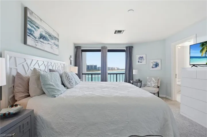 Experience the beauty of Gulf Coast luxury waterfront living at Isles of Capri in this exceptional 2 bedroom, 2.5 bath coastal residence offering breathtaking, panoramic views of the Gulf of Mexico and the Marco River. Located in the highly sought-after La Peninsula community near Marco Island, this light-filled condominium blends elegant design, comfort, and spectacular waterfront scenery. The open-concept living, dining, and kitchen spaces create a seamless flow that is perfect for entertaining or relaxing while enjoying wide-angle water views. Natural light fills the residence, enhancing the tranquil coastal atmosphere. The primary suite is a serene retreat, featuring expansive water views and a spacious ensuite bath with dual vanities, a jetted soaking tub, and a separate walk-in shower, creating a spa-like environment for relaxation. The guest suite, complete with its own private bath, provides exceptional comfort and privacy for visiting friends and family. Step onto the private balcony to enjoy peaceful waterfront living—perfect for morning coffee, sunset cocktails, and watching dolphins and boats pass along the Marco River. With both sunrise and sunset views, the setting is truly unforgettable.
