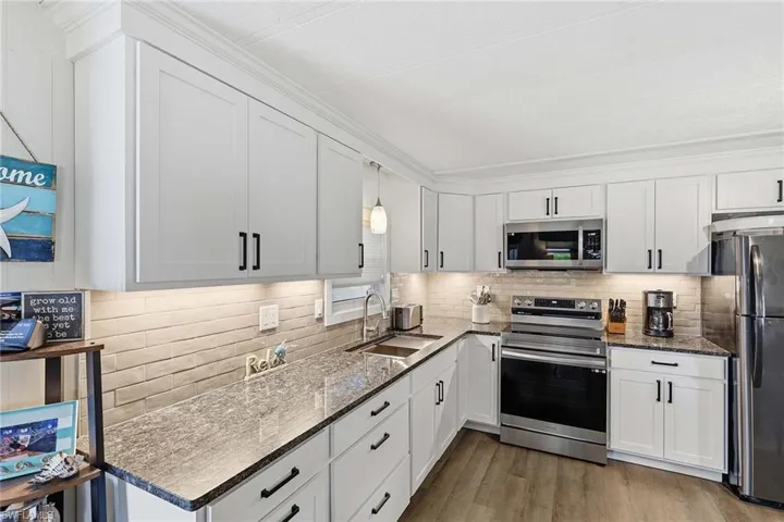 This beautifully maintained 2-bedroom, 2-bath home features exquisite tile flooring throughout the main living areas and a designer kitchen equipped with granite countertops, a custom backsplash, and under-cabinet lighting. The primary suite includes a spacious walk-in closet and a private bath with a stand-alone shower, creating a comfortable retreat. Enjoy Florida living year-round in the large screened-in patio, perfect for relaxing or entertaining any time of day. Outside, you’ll find ample parking for your boat, golf cart, or oversized vehicles, along with two separate storage units—ideal for golf clubs, beach gear, and more. Residents of Mariners Cove enjoy access to a fantastic community pool and private boat ramp, setting this neighborhood apart from the rest. Conveniently located near shopping, dining, and all the best of Southwest Florida, Mariners Cove offers the lifestyle you’ve been looking for—and truly deserve.