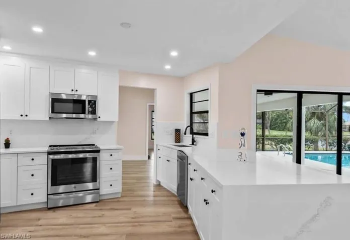 Inside, you’ll find both a formal living room and a generous family room, providing flexible space for everyday living. The updated kitchen serves as the heart of the home, featuring quartz waterfall island, modern finishes, and bright, airy tones that reflect the Florida lifestyle.