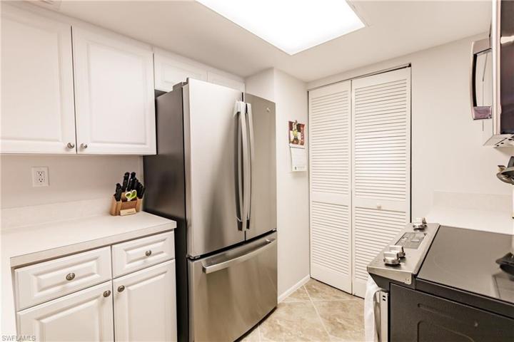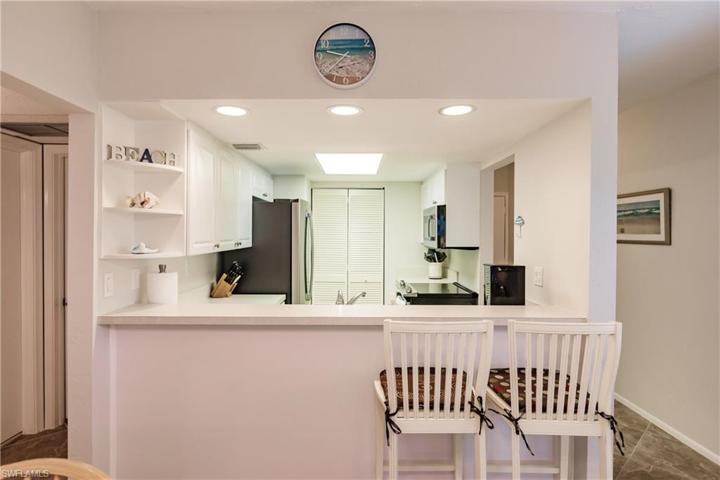 Superbly located 2 bedroom, 2 bath corner unit is just a block from Residents Beach! Impact windows & sliders provide plenty of natural light throughout these tastefully decorated living & dining areas. Freshly painted, and located on the first floor, includes a uniquely built, L-shaped, wrap around lanai with no-see-um screens for outside enjoyment. Clean kitchen with breakfast bar, newer stainless appliances, in-unit washer & dryer (2020), water heater replaced in 2017, and A/C in 2022. Remodeled baths and walk-in closets provide ample storage. Assigned parking, easy access to 2 heated pools and minutes from Marco Island’s best shopping, dining, and entertainment! This is a must see!!!