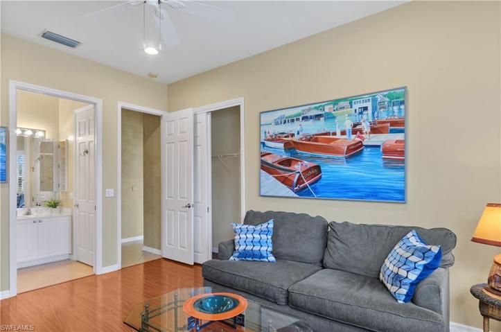 MOTIVATED SELLER. A Marvelous LOCATION. Walk through the front door and you are immediately drawn toward the large patio, pool and spa that provide a wonderful venue for entertaining. The panoramic screened lanai provides a magnificent unobstructed view of the water and the Miromar Lakes Golf Clubhouse. This 2-bedroom 2-bath plus Den home has recently purchased appliances, natural gas oven and stove top, microwave, side by side refrigerator, wine cooler with an eat in breakfast area that overlooks the lake. It has a tankless water heater and filtered water system. The hurricane patio shutter provides protection for the home and lets in light. This home, offered ‘as is’,is all about the VIEW. St. Moritz has a one time Capital fee of $2,500. Buyers to assume balance of the CDD