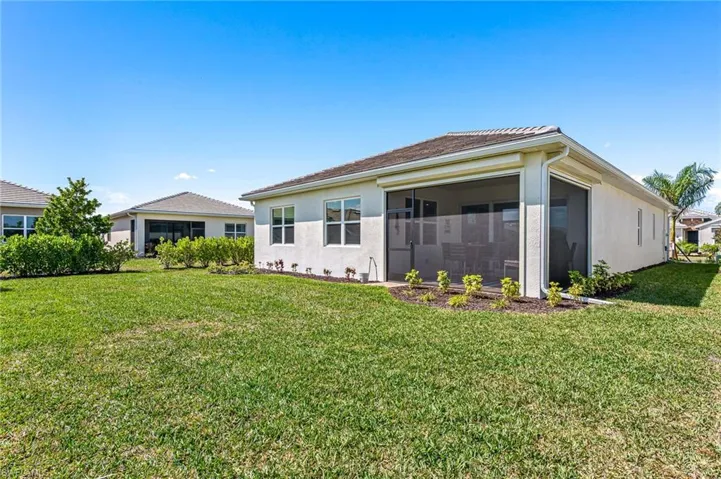 This home is immaculate and move in ready! This 2000 square foot, 3 bedroom, 2 full bath and one half bath, Charlotte floor plan was finished in August of 2023 and has all the upgrades. The kitchen boasts 42 inch soft close cabinets with molding and under cabinet lighting. The stainless steel appliances have all been upgraded along with quartz countertops and plank tile flooring. Hurricane windows are throughout the home with electric roll down hurricane screens on the back patio providing both safety and privacy. Enjoy the sunrise on the back patio in the morning overlooking the lake view. This freshly painted home has crown molding throughout the living area as well as custom closets for greater storage and organization. The floor plan boasts an extended garage for additional room. The amenities within Seasons at Bonita include 8 pickleball courts, three tennis courts, a resort style pool with a lap pool, bocce courts, a dog park, a wonderful workout facility and community room. This is a home and community you do not want to miss.