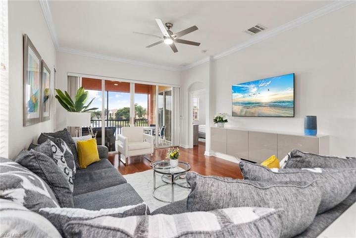 Probably one of the prettiest views in Rapallo, Expansive lake and fountain views. END UNIT SECOND FLOOR COACH HOME. Kitchen has been recently updated with Quartzite countertops, stainless steel appliances white cabinetry, tiled backsplash, Reverse Osmosis, great space for entertaining. AC 2019, Hot water heater 2019, Washer, dryer 2022. WIFI Thermostat and Garage Door. Great Room has crown molding and wood floors. 10″ ceilings throughout. Being an end unit with extra windows and southeast exposure this condo is very light and bright. Master bedroom has a sliding door that opens out to the lanai. Master Bath has duel sinks and a large walk in shower. Second bathroom has a deep soaking tub. Enter your unit from a single car garage. Rapallo is a Mediterranean style resort community with wonderful amenities such as; 2 lagoon style pools, spa, rock grotto waterfalls, screened jr olympic lap pool, 5 har tru tennis courts, full time tennis pro. The Activity Director will keep your calander full. Fitness Center is manned with a full time Fitness Director. Clubhouse with full catering kitchen& Library. Bocce Ball, 2 more pools, walking & bike paths, so much more! The best part:walk to the Coconut Point Mall. Just 12 miles to the International Airport, and minutes to our beautiful beaches.