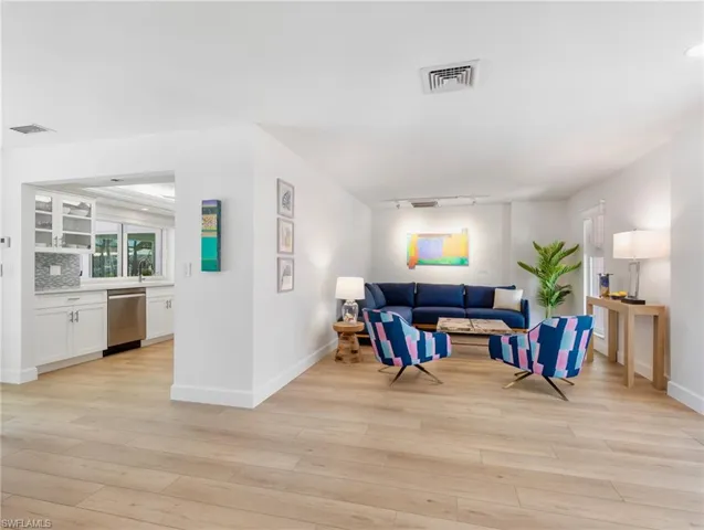 Situated on a southern exposure gulf-access lot overlooking a 120ft wide sailboat access canal, this 3 bedroom, 3 bath pool home is effectively a new home including a metal roof installed May 2025! An artist lives here, which explains why this mid-century modern remodeled waterfront home in Palm Acres near Sanibel is so stunningly beautiful. Watch the video and look closely at the photos to see the many reasons why you should come preview this property for yourself. All windows, sliders, and doors are now impact rated with the added benefit of a peacefully quiet interior. Upon arrival the curb appeal is immediately obvious from the professional landscaping to the oversized pavered driveway to the high-quality metal roof to the attractive front entry. The central focus is the new custom kitchen by Cornerstone Cabinets with quartz countertops, dazzling backsplash, tray ceiling, and stainless Samsung appliances. A favorite standout, believe it or not, are the interior doors! All three bathrooms are GORGEOUS with two accented by quartz countertops while the primary bath pops with blue pearl granite. Swim in the heated pool, relax within the pool cage lanai outdoor living area, cast a line for a trophy catch from your own private dock, or set out on a boating adventure launched from your 10,000 lb boat lift. Ask for a list of all new mechanical equipment. New West Elm furniture is negotiable. Call now!
