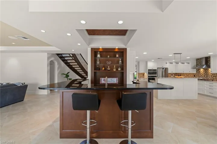 Experience the pinnacle of coastal living in Shell Harbor. Set along more than 120 feet of waterfront on one of Sanibel’s premier direct Gulf-access canals (no bridges!), this beautifully reimagined 4-bedroom + den, 4.5-bath residence blends luxury, light, and livability. Enter through custom wood doors into a sun-drenched foyer where soaring ceilings, a statement chandelier, and multi-level design create a sense of openness and elegance. The home features tile flooring throughout, an elevator, and a thoughtfully flowing layout ideal for both everyday living and entertaining. The showpiece kitchen showcases Taj Mahal quartzite countertops, custom wood cabinetry, stainless steel appliances, a gas cooktop, and a dedicated bar area perfect for hosting family and friends. The primary suite offers a private retreat with a balcony overlooking the water, vaulted ceilings, a spa-style bath with soaking tub and walk-in tiled shower, an expansive closet, and a laundry room for added convenience. Guest suites on the lower level provide ample comfort and privacy. Step through impact glass sliders to the outdoor oasis—complete with a covered patio, cook-in cabana, sparkling pool, and a private dock featuring composite decking and a boat lift for effortless Gulf access. Located on Sanibel’s desirable East End, this property offers easy on/off island access and includes community deeded beach access, combining island charm with unmatched boating and beachside convenience.