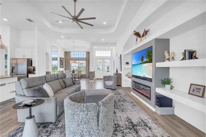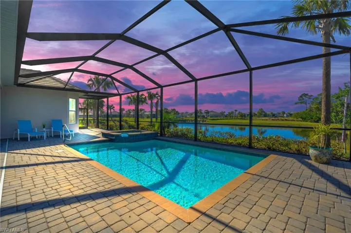 Welcome to a rare opportunity to own one of the most distinguished estate homes in Heritage Landing, complete with an exclusive GOLF MEMBERSHIP. This BOUGAINVILLEA residence features THREE SPACIOUS BEDROOMS PLUS A VERSITAL DEN, which can easily serve as a fourth bedroom, and THREE FULL SIZE BATHROOMS, including one with convenient pool access. An OVERSIZED TWO CAR side-entry garage. Step through the entryway and be greeted by soaring 14-FOOT CEILINGS, setting the stage for elegance. The LIVING ROOM’S CUSTOM ACCENT WALL showcases refined craftsmanship, featuring Shiplap detailing, decorative shelving, and a Fireplace, creating an inviting focal point. Throughout the home, WOOD-LOOK TILE FLOORING adds warmth and timeless style. The gourmet kitchen features shaker-style cabinetry, stainless steel appliances, and exquisite granite countertops. DESIGNER LIGHTING illuminates the expansive island, breakfast nook, and formal dining area, where a CUSTOM MIRRORED WALL AND LUXURIOUS DRAPERIES add an air of sophistication. The den/home office is bathed in natural light, featuring an elegant COFFERED CEILING and a full closet, making it a perfect workspace or additional bedroom. The primary suite is a private sanctuary, offering a spacious seating area, floor-to-ceiling draperies, and dual walk-in closets. The spa-inspired ensuite bathroom indulges with a double shower, dual vanities, a soaking tub, a makeup station, and a private water closet, a true retreat. Guests will revel in their own private havens, with spacious secondary bedrooms, each featuring ensuite baths for ultimate comfort. Even the laundry room has been thoughtfully designed with ample space and abundant natural light, transforming chores into a pleasure. Outside, embrace the ultimate Florida lifestyle on the expansive lanai, where a HEATED POOL AND SPA await. The CUSTOM OUTDOOR KITCHEN AND GRILL AREA are perfect for entertaining, while the covered seating area invites you to unwind and take in the PICTURESQUE VIEWS OF THE 8TH HOLE ON ONE OF SOUTHWEST FLORIDA’S TOP RATED GOLF COURSES. As the SUN SETS over the tranquil WATER VIEW, you’ll realize this home is more than a residence, it’s a masterpiece of luxury MAINTENANCE FREE living. This pristine, barely-lived-in home is ready to be yours. When you are not busy on the 18 Hole, Par 71 Gordon Lewis Golf Course, there is also a 24/7 Fitness center, Sauna & Spa. Or explore the 6 Har Tru Tournament Tennis courts & 6 Pickleball courts both with 3.5-4 level play, 2 Bocce Ball courts, a Tiki Bar and Heated Resort Pool with Beach entry and Lap lanes. There are 4 additional Heated Satellite pools! Under construction is a Club House with a Grill Room, Fine Dining and meeting rooms.