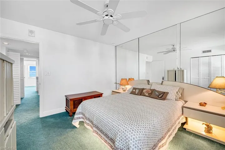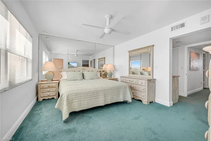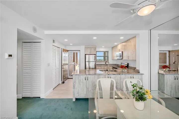 Experience unparalleled waterfront living with your private boat slip included in this meticulously remodeled two-bedroom, two-bath condominium in Eagle Cay on Marco Islands sought-after south end. This residence offers breathtaking panoramic views of the Marco River and Caxambas Pass, providing a serene backdrop for daily life. Boating enthusiasts will appreciate the convenience of a newly rebuilt private boat dock, offering direct access to the Gulf of Mexico! The modern kitchen features quartz countertops, ample storage with soft-close cabinetry, recessed lighting and stainless steel appliances. Adjacent to the kitchen, the dining area and living room are enhanced by a custom mirror wall that amplifies natural light. From here, go out to the screened lanai through floor-to-ceiling glass sliders, offering a setting for morning coffee or sunset cocktails with stunning waterfront vistas. The primary suite also boasts a custom mirror accent wall, an en-suite bath with dual sinks, quartz countertops and a recently re-tiled walk-in shower with a glass enclosure. The second bedroom is adjacent to a well-appointed guest bath featuring a shower-tub combination. Additional updates include fresh paint, new carpet, tile flooring, replaced lanai screens, and upgraded HVAC and hot water systems for enhanced efficiency. In 2024, all windows were replaced with impact-resistant glass, ensuring comfort and tranquility. Residents of the pet-friendly Eagle Cay community enjoy resort-style amenities, including private and common boat docks, two heated pools, tennis and pickleball courts, bocce, shuffleboard, a large pavilion and beautifully maintained tropical landscaping. In 2023, the community completed a comprehensive dock replacement, enhancing the boating experience. This waterfront retreat offers the ideal island getaway, combining modern luxury with the natural beauty of Marco Island.